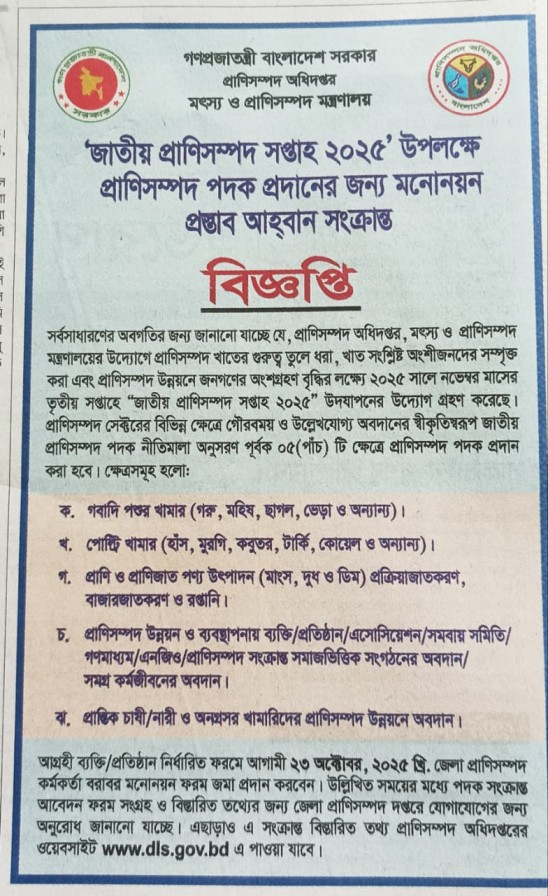 জাতীয় প্রাণিসম্পদ পদক সংক্রান্ত বিজ্ঞপ্তি